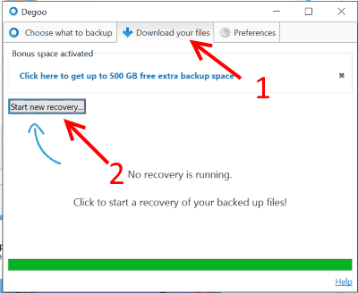 ส่วนดาวน์โหลดนั้น ให้ติ๊กที่แท็บ download your file แล้วเลือก start new recovery แล้วเลือกไฟล์ที่จะดาวน์โหลดจาก cloud degoo ลงเครื่องผ่านโปรแกรมได้เลย